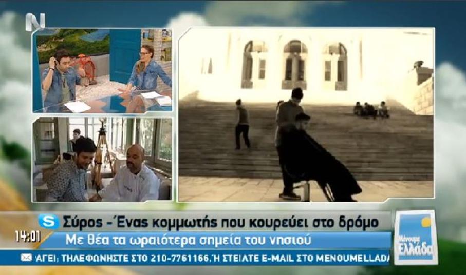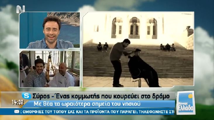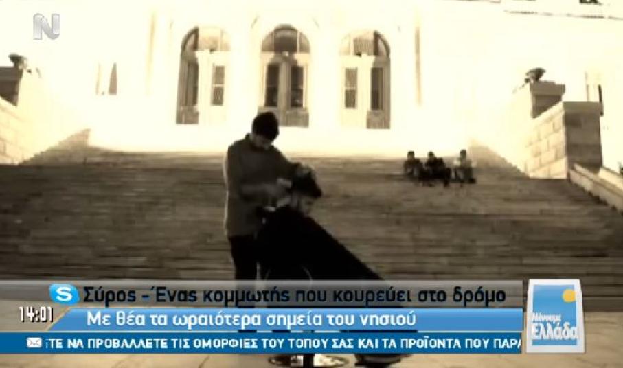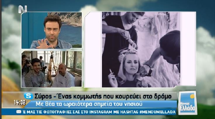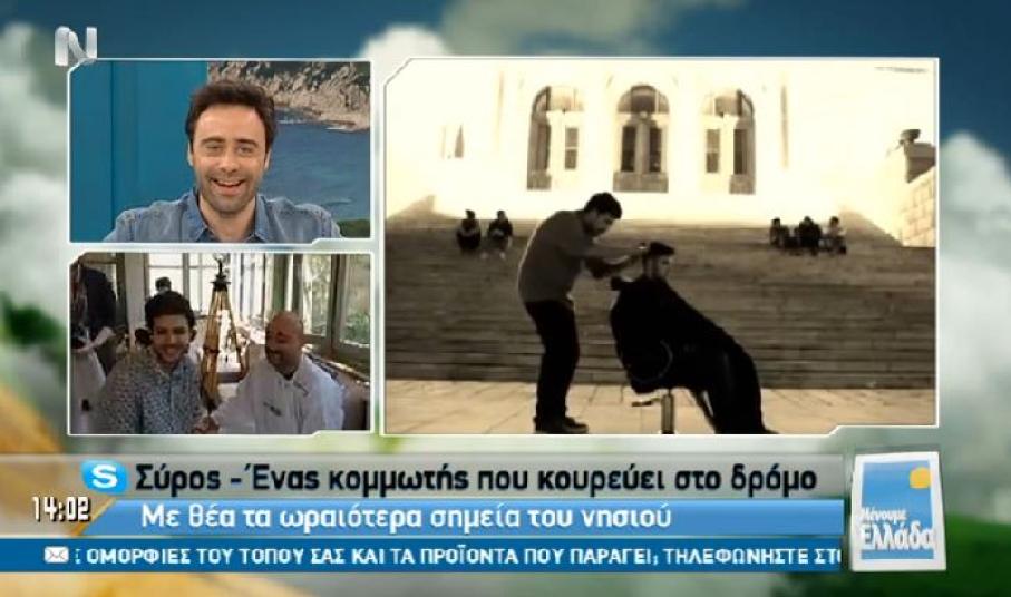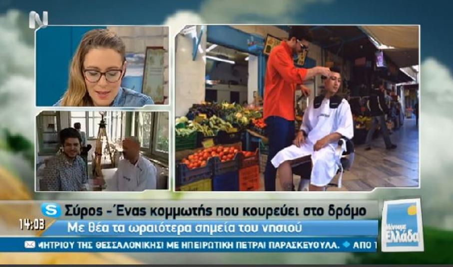 Στη Σύρο ταξίδεψε το μεσημέρι της Παρασκευής η εκπομπή “Μένουμε Ελλάδα” της ΝΕΡΙΤ με οδηγό τον κομμωτή Άγγελο Βαρθαλίτη.
