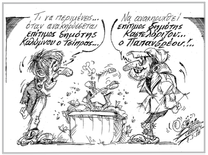 Το σκίτσο της ημέρας Δευτέρα 8 Ιανουαρίου 2018 - 06:21 Έντυπη Έκδοση Σκίτσο του Τάκη Χάλαρη με θέμα: «Επίτιμος δημότης» Διαφήμιση #Το σκίτσο της ημέρας
