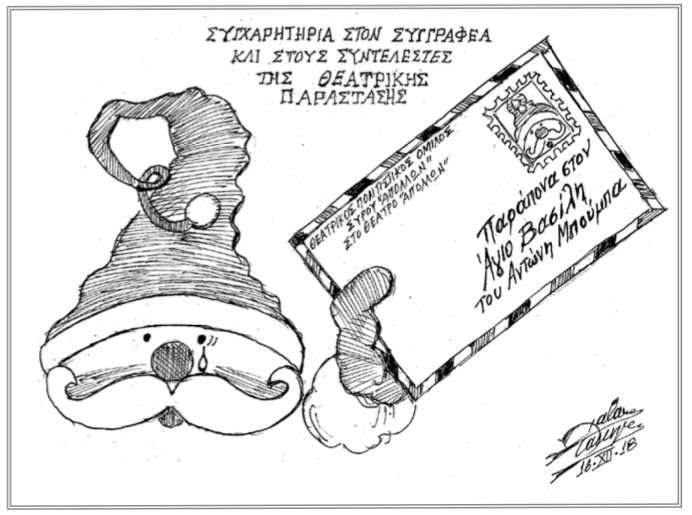Το σκίτσο της ημέρας Δευτέρα 17 Δεκεμβρίου 2018 - 07:45 Έντυπη Έκδοση Σκίτσο του Τάκη Χάλαρη με θέμα: "Υπέροχη θεατρική παράσταση" Διαφήμιση #Το σκίτσο της ημέρας