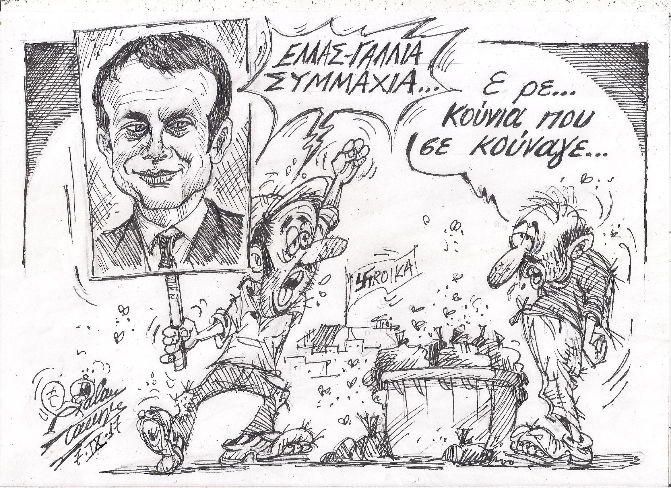 Σκίτσο του Τάκη Χάλαρη με θέμα: "Επίσκεψη Μακρόν"