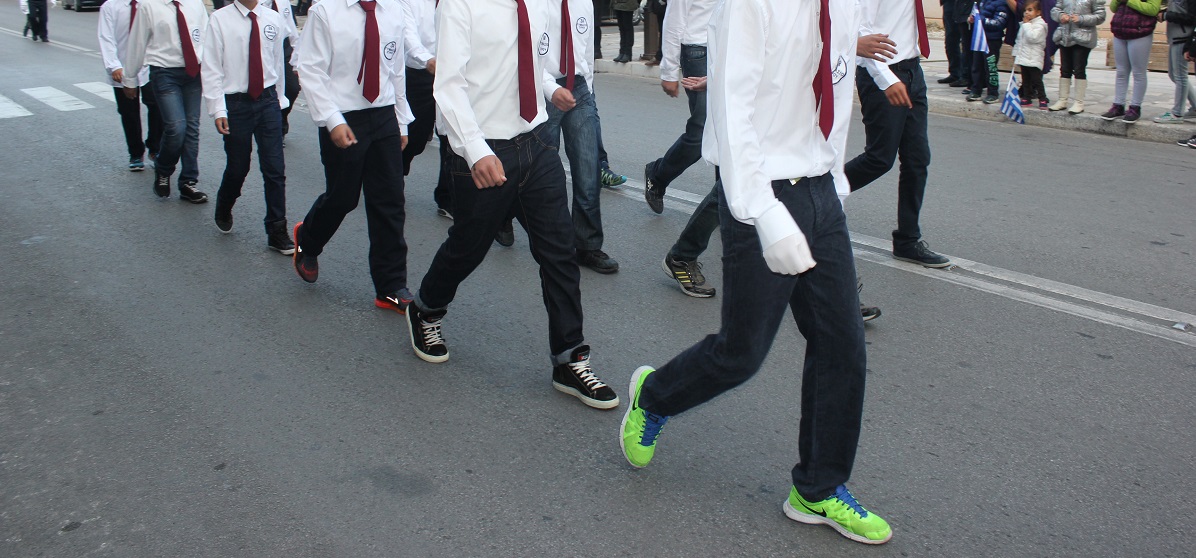 Στην παρέλαση τα αγόρια φορούν άσπρο πουκάμισο, μπλε παντελόνι και μαύρα παπούτσια. ΟΧΙ. Εγώ θα βάλω skinny τζιν και τα αθλητικά μου. ΟΧΙ. Αν περάσεις με τα κίτρινα φλούο από το Ηρώων θα σε κρατήσουν για ανακλαστήρα στις νησίδες. ΟΧΙ. Θα είμαι μια φωτεινή πινελιά στο μουντό κάδρο ενός φασιστικού συστήματος που μας θέλει όλους στρατιώτες. ΟΧΙ. Στη στεφάνωση πηγαίνεις, όχι για καφέ. Θα ντυθείς αναλόγως. ΟΧΙ. Γιατί μετά, θα πάω και για καφέ. Γιατί να αλλάζω; Μήπως να συνδυάσω τα παπούτσια με τους καινούριους μου καθρέφτες; ΟΧΙ.
