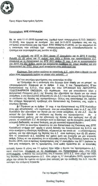 Έξι μήνες αργότερα από τις εκλογές του Ιουνίου για την ανάδειξη νέου Δ.Σ., θα έχουμε και πάλι... εκλογές. Αυτή είναι η απάντηση στην ερώτηση που τέθηκε από την πλευρά του κ. Καφτηράνη, για το αν πρέπει ή όχι να γίνουν εκλογές μέχρι το τέλος του έτους. Αν δεν αλλάξει κάτι, το Διοικητικό Συμβούλιο της Ένωσης άμεσα θα πρέπει να προκηρύξει εκλογές για την ανάδειξη νέου διοικητικού συμβουλίου, με θητεία πλέον τετραετίας. Σύμφωνα με το καταστατικό της ΕΠΣ Κυκλάδων οι εκλογές έπρεπε να γίνουν τον προσεχή Δεκέμβρη και όχι τον Ιούνιο που έγιναν. Τώρα για ποιον λόγο έγιναν εκλογές τον Ιούνιο του 2015 θα πρέπει να το απαντήσει η πρώην διοίκηση της Ένωσης και όχι εμείς που προσπαθούμε να βγάλουμε απλά κάποιο συμπέρασμα.