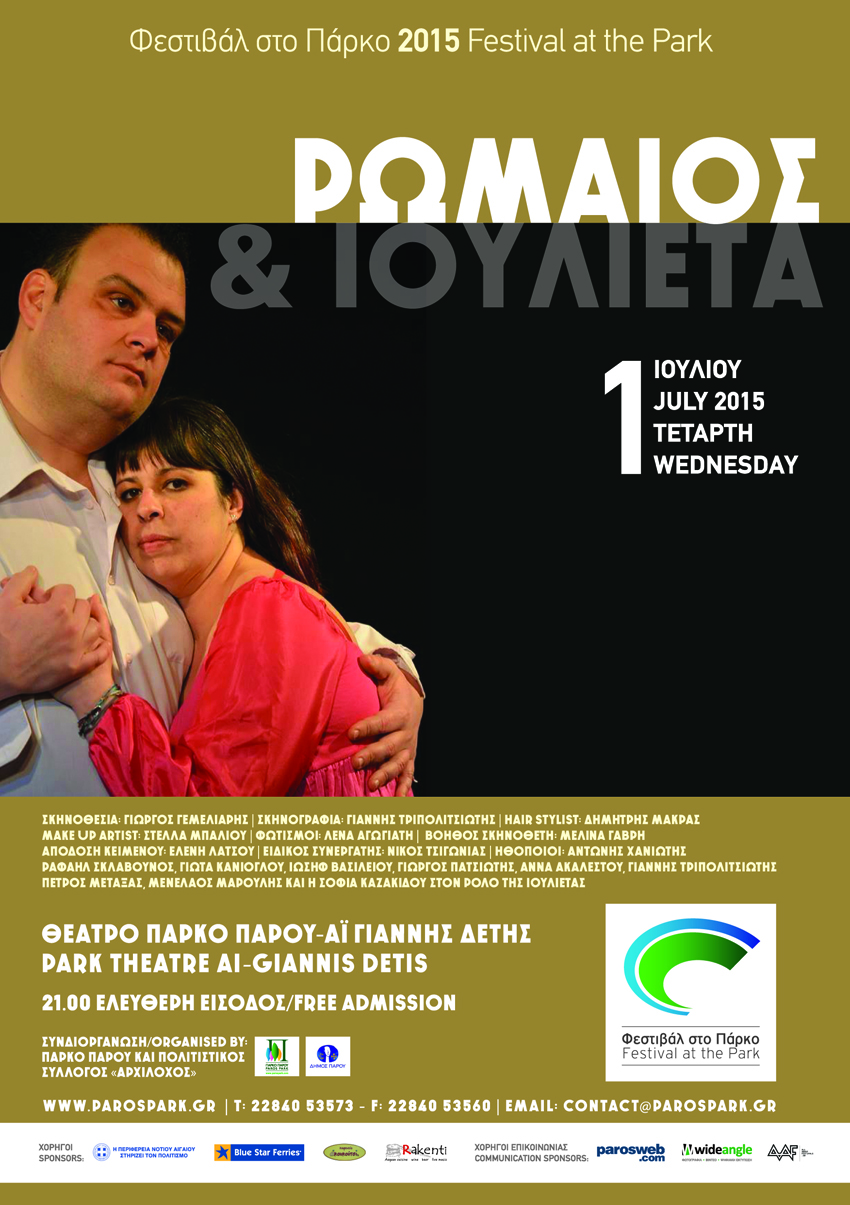 Η θεατρική ομάδα του πολιτιστικού συλλόγου Πάρου «Αρχίλοχος» θα παρουσιάσει την κωμωδία του Μπόστ «Ρωμαίος και Ιουλιέτα». 1/7 21:00 στο Ανοιχτό Θέατρο Αη Γιάννη Δέτη Πολιτιστικό Πάρκο Πάρου