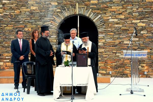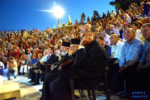 Στο κατάμεστο νέο ανοικτό θέατρο, τελέσθηκαν την Παρασκευή το βράδυ ο αγιασμός και τα εγκαίνια. Με ένα λιτό τελετουργικό, οι Ανδριώτισσες και οι Ανδριώτες υποδέχτηκαν με ένα ζεστό χειροκρότημα το νέο έργο πνοής για το νησίμας, που αποτελεί δωρεά του εφοπλιστή κ. Αλκιβιάδη Τάττου στον τόπο που γεννήθηκε και μεγάλωσε.