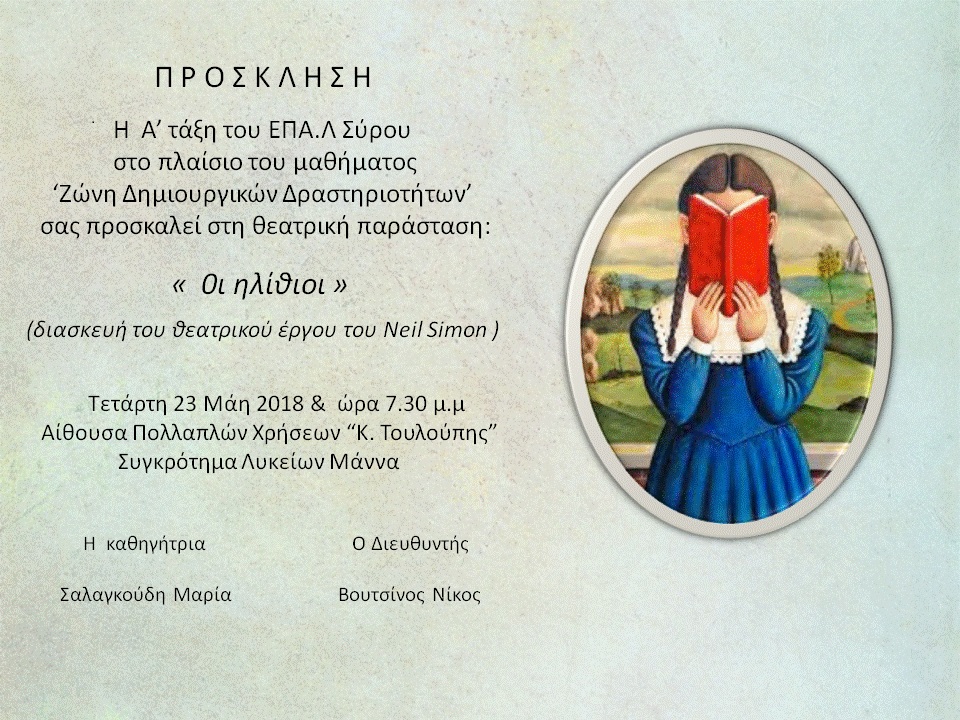 Η Α’ Τάξη του Ημερήσιου ΕΠΑΛ Σύρου στο πλαίσιο του μαθήματος «Ζώνη Δημιουργικών Δραστηριοτήτων» σας προσκαλεί στη θεατρική παράσταση «ΟΙ ΗΛΙΘΙΟΙ» , (διασκευή του θεατρικού έργου του Neil Simon), την Τετάρτη 23 Μαΐου 2018 και ώρα 07:30 μ.μ.
