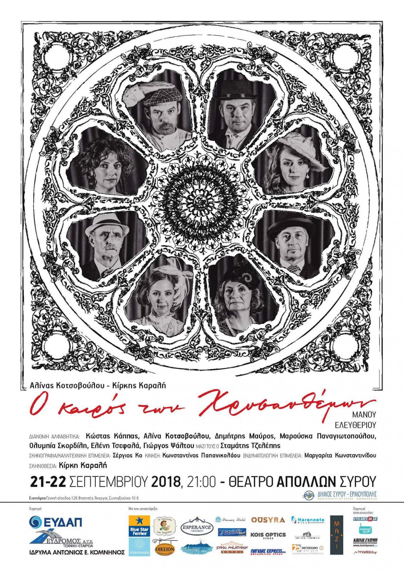 Η πρόταση για τις παραστάσεις στο Θέατρο Απόλλων υποβλήθηκε πριν ακόμα ξεκινήσει η θεατρική διασκευή του μυθιστορήματος. Η απάντηση ήρθε τον Μάρτιο του 2018, δύο ημέρες μετά τα γενέθλια του Μάνου Ελευθερίου. Πρεμιέρα στις 21 και 22 Σεπτεμβρίου. Η Αλίνα Κοτσοβούλου τονίζει τη λέξη «πρεμιέρα». «Το έργο έχει γραφτεί για το Θέατρο της Ερμούπολης. Η Ευαγγελία Παρασκευοπούλου πηγαίνει με τον θίασό της για μία παράσταση στο Θέατρο Απόλλων. Κι εγώ είπα ότι θέλω να κάνω πρεμιέρα σε αυτό το μαγικό θέατρο».