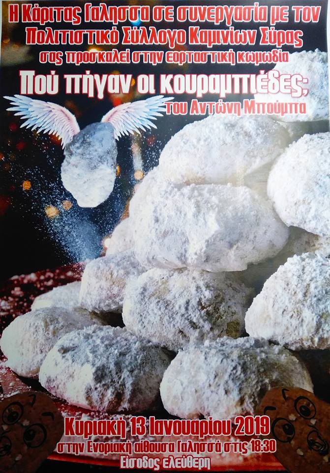 Η εορταστική κωμωδία «Πού πήγαν οι κουραμπιέδες», σε σκηνοθεσία Γιώργου Σιγάλα, παρουσιάστηκε με επιτυχία την Πέμπτη 3 και την Παρασκευή 4 Ιανουαρίου 2019 στον διαμορφωμένο χώρο του Συλλόγου, χαρίζοντας σε μέλη αλλά και σε θεατρόφιλους από όλο το νησί μοναδικές στιγμές γέλιου.