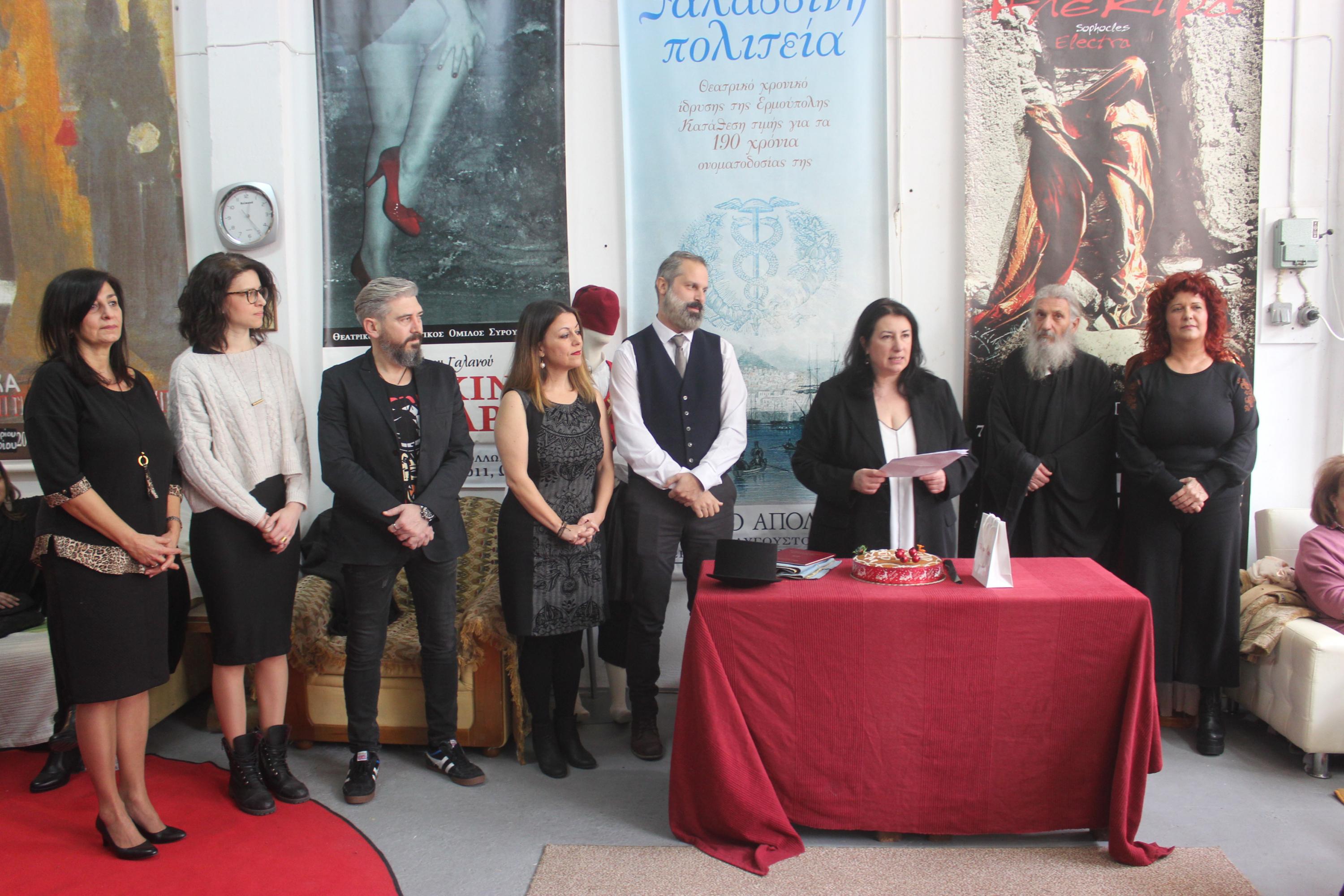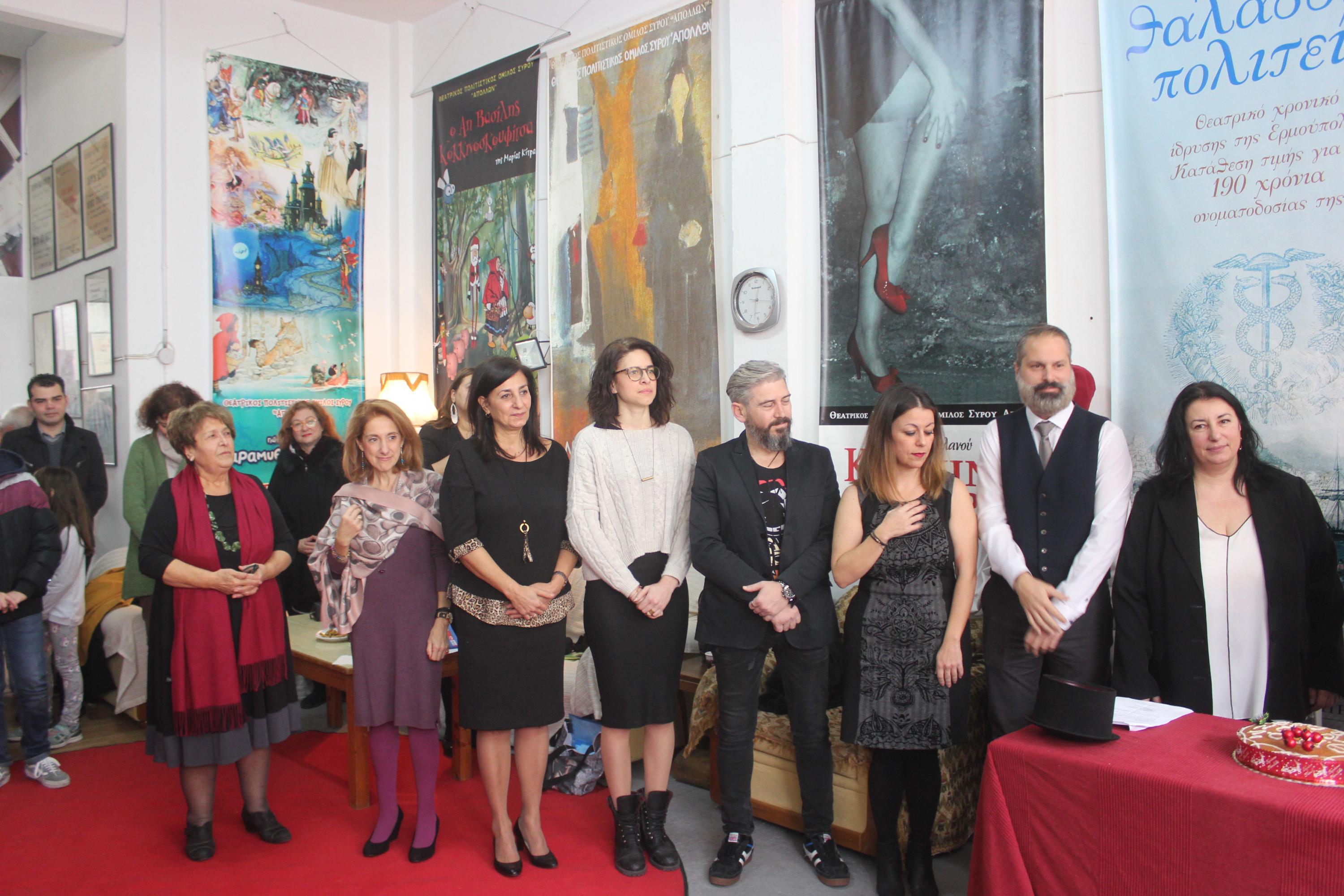 Εκπρόσωποι του Δήμου Σύρου – Ερμούπολης, πρόεδροι πολιτιστικών συλλόγων και φορέων του νησιού (ΛΕΣ, Μουσικός Όμιλος, Σύλλογοι Ποντίων και Βορειοελλαδιτών, Μικρασιατών), μέλη και φίλοι αντάμωσαν στα γραφεία του Ομίλου, καθισμένοι ανάμεσα σε σκηνικά παλαιότερων παραστάσεων που αξιοποιήθηκαν για τις ανάγκες της εκδήλωσης αλλά και σε αφίσες και banners «Απολλώνιων» παραγωγών που αγαπήθηκαν και άφησαν τη δική τους ιστορία στην πρωτεύουσα των Κυκλάδων.