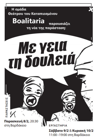 Η Ομάδα Θεάτρου του Καταπιεσμένου Βoalitaria παρουσιάζει την παράσταση Θεάτρου Φόρουμ «Με γεια τη δουλειά», την Παρασκευή 8 Φλεβάρη στις 8.30μμ στη Βαρδάκειο Σχολή Ερμούπολης και σας καλεί το Σάββατο 9 και την Κυριακή 10 Φλεβάρη 11:00-19:00, στο εργαστήρι πολλαπλασιασμού Ακτιβιστικών ομάδων Θεάτρου του Καταπιεσμένου.