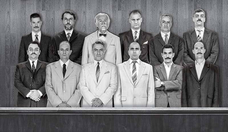 Οι 12 ένορκοι (αλφαβητικά): Νίκος Βατικιώτης, Τάσος Γιαννόπουλος, Σωτήρης Δούβρης, Μάνος Ζαχαράκος, Αλέξανδρος Καλπακίδης, Θανάσης Κουρλαμπάς, Περικλής Λιανός, Κωνσταντίνος Μουταφτσής, Κωνσταντίνος Μπάζας, Παντελής Παπαδόπουλος, Τάσος Παπαδόπουλος, Ορέστης Τρίκας.