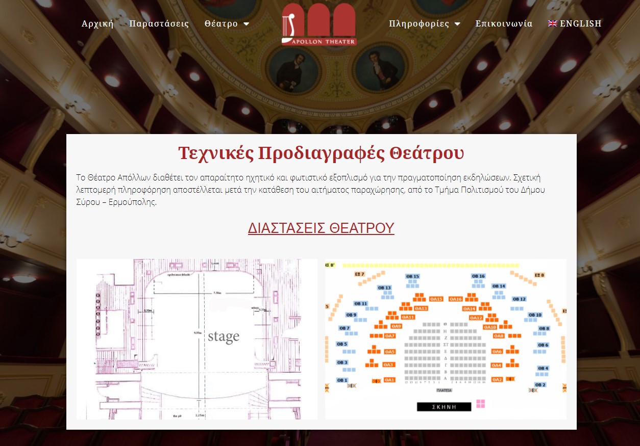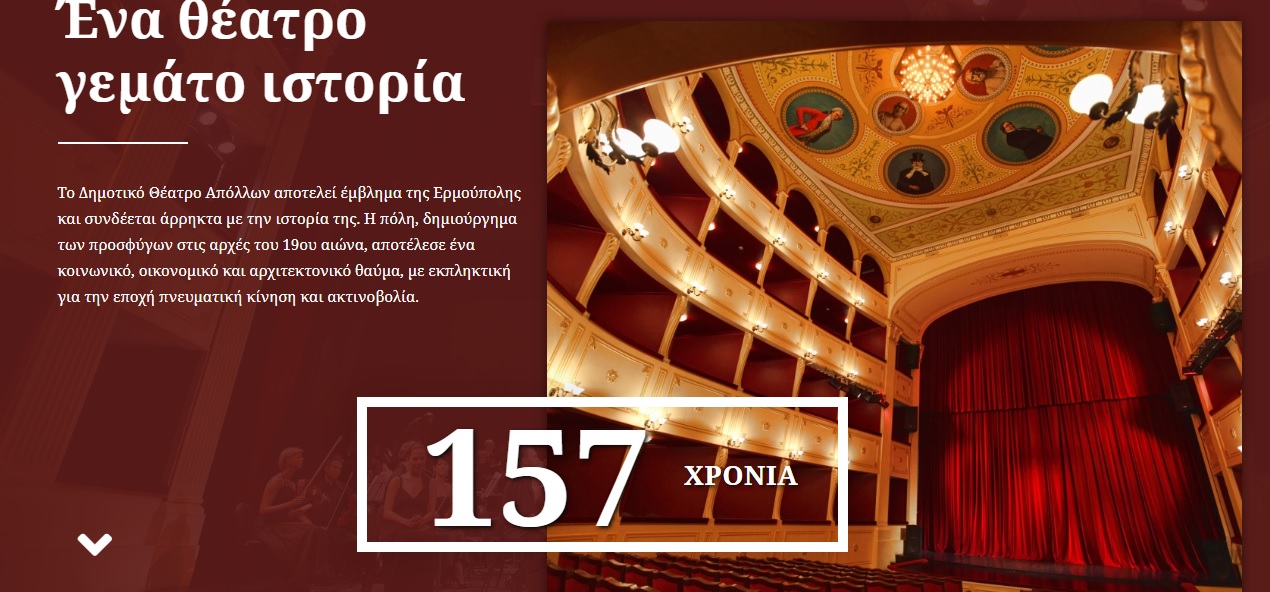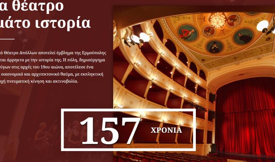 Στόχος του Τμήματος Πολιτισμού του Δήμου Σύρου - Ερμούπολης είναι το Θέατρο Απόλλων να αναδείξει την ομορφιά του και τη δράση του μέσα από το διαδίκτυο με μια σύγχρονη δίγλωσση ιστοσελίδα. Η καινούρια σελίδα (https://apollontheater.gr) είναι σύμφωνη με τα νέα πρότυπα ασφαλείας & αισθητικής, είναι εύκολη στην πλοήγηση για το χρήστη και λειτουργική σε tablet και κινητά.