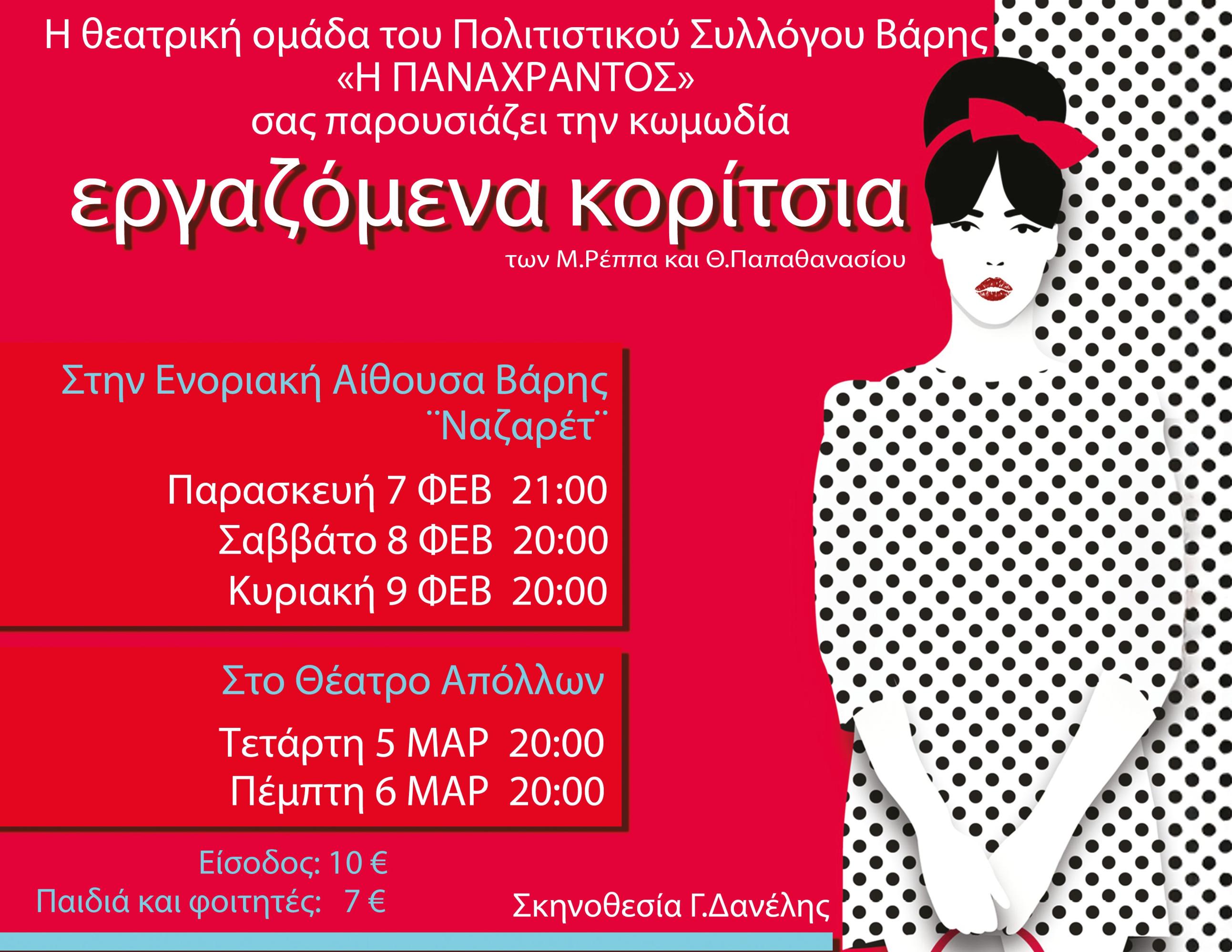 Ο Πολιτιστικός Σύλλογος Βάρης "Η Πανάχραντος" παρουσιάζει την κωμωδία "Εργαζόμενα Κορίτσια" των Μιχάλη Ρέππα και Θανάση Παπαθανασίου. Πρόκειται για μία ξεκαρδιστική θεατρική παράσταση, που υπόσχεται γέλιο, ανατροπές και στιγμές ανεμελιάς για όλη την οικογένεια.