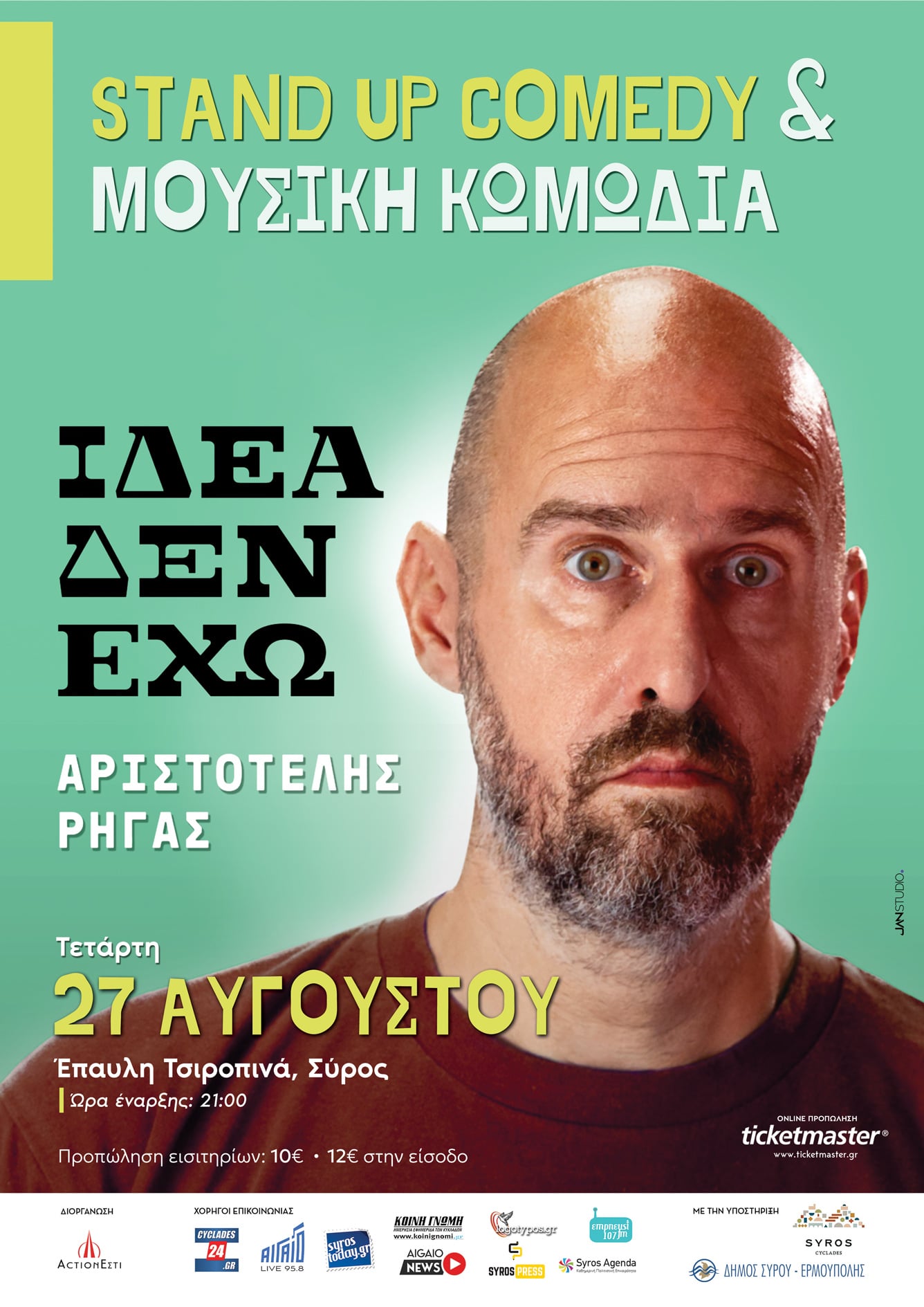 Η Σύρος υποδέχεται μια ξεχωριστή βραδιά κωμωδίας με τον Αριστοτέλη Ρήγα, έναν από τους πιο αγαπημένους stand-up comedians και μουσικούς της Ελλάδας, που επιστρέφει στο νησί με την ολοκαίνουργια παράστασή του «Ιδέα δεν έχω».
