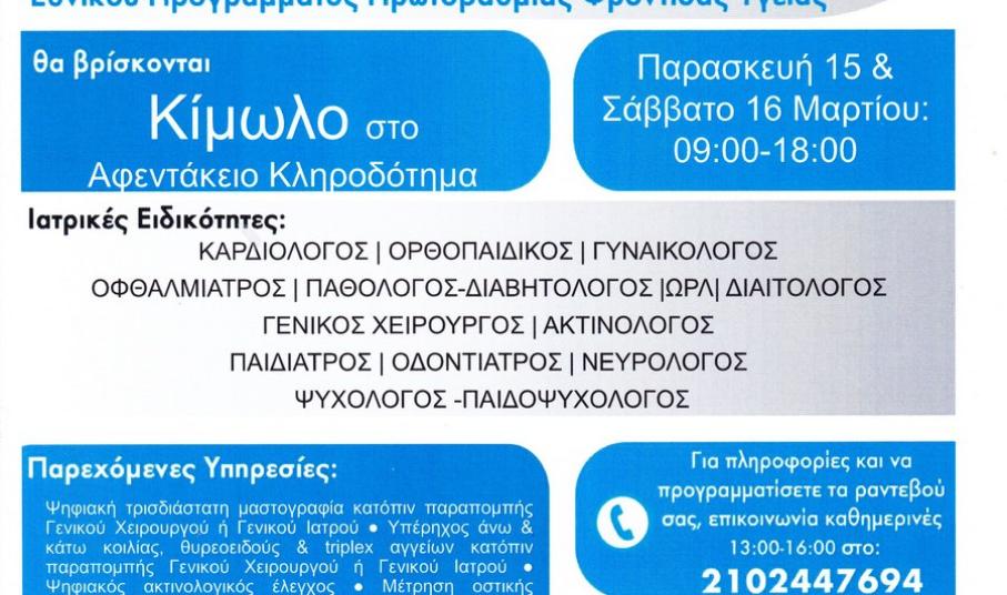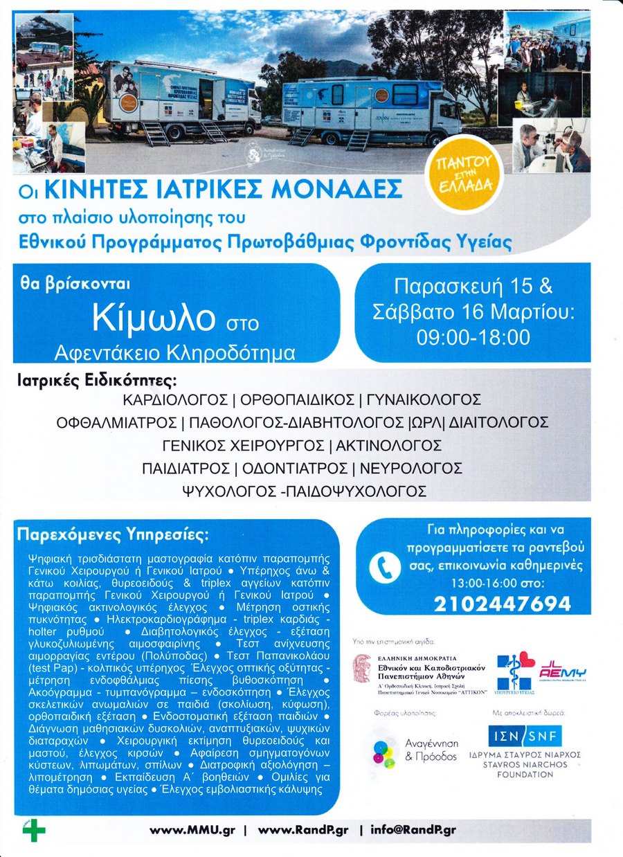 Οι Κινητές Μονάδες Υγείας στην Κίμωλο Δευτέρα 4 Μαρτίου 2019 - 06:21 Οι Κινητές Μονάδες Υγείας στην Κίμωλο στις 15 και 16 Μαρτίου. Διαφήμιση Πατήστε για αναλυτικές πληροφορίες την αφίσα. #Κυκλάδες #Υγεία #Κινητές Μονάδες Υγείας