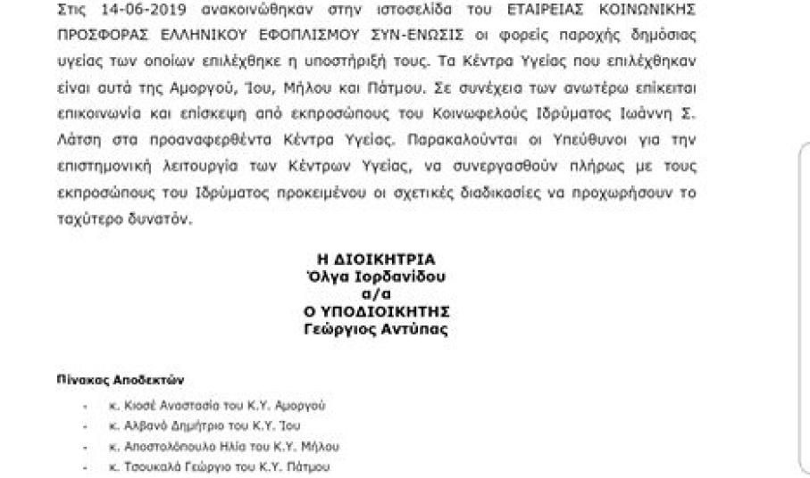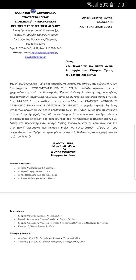 Σύμφωνα με την Διοικήτρια της 2ης ΥΠΕ Πειραιώς και Αιγαίου, κ. Ιορδανίδου, «το Ίδρυμα Λάτση αποδέχθηκε το αίτημα της 2ης ΥΠΕ και προχωρά αμεσα στην υλοποίηση του. Αξιοποιούμε τους πόρους προκειμένου να αυξήσουμε το αίσθημα ασφάλειας και την αυτάρκεια των δομών προς όφελος των κατοίκων των νησιών μας. Ευχαριστούμε και συνεχιζουμε με επιχορηγηση απο το Υπουργειο Υγειας για τοποθέτηση μονάδων παραγωγής οξυγόνου σε αλλα 17 Κ.Υ. του Αιγαιου».