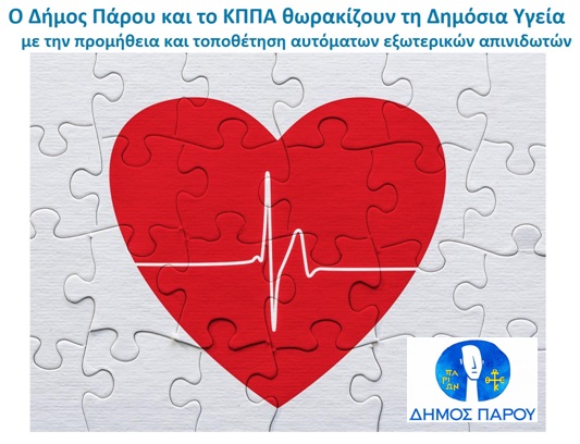 Ο Δήμος Πάρου σε μία προσπάθεια συμβολής στην ενίσχυση των δομών Υγείας για την αντιμετώπιση αιφνίδιων καρδιακών επεισοδίων, τοποθέτησε σε κεντρικά σημεία των περιοχών Αλυκής, Μάρπησσας και Νάουσας, φορητούς αυτόματους εξωτερικούς απιδινωτές 24ωρης ετοιμότητας, με τη συνδρομή του Ν.Π.Δ.Δ. Κοινωνικής Προστασίας Πρόνοιας & Αλληλεγγύης Δήμου Πάρου.