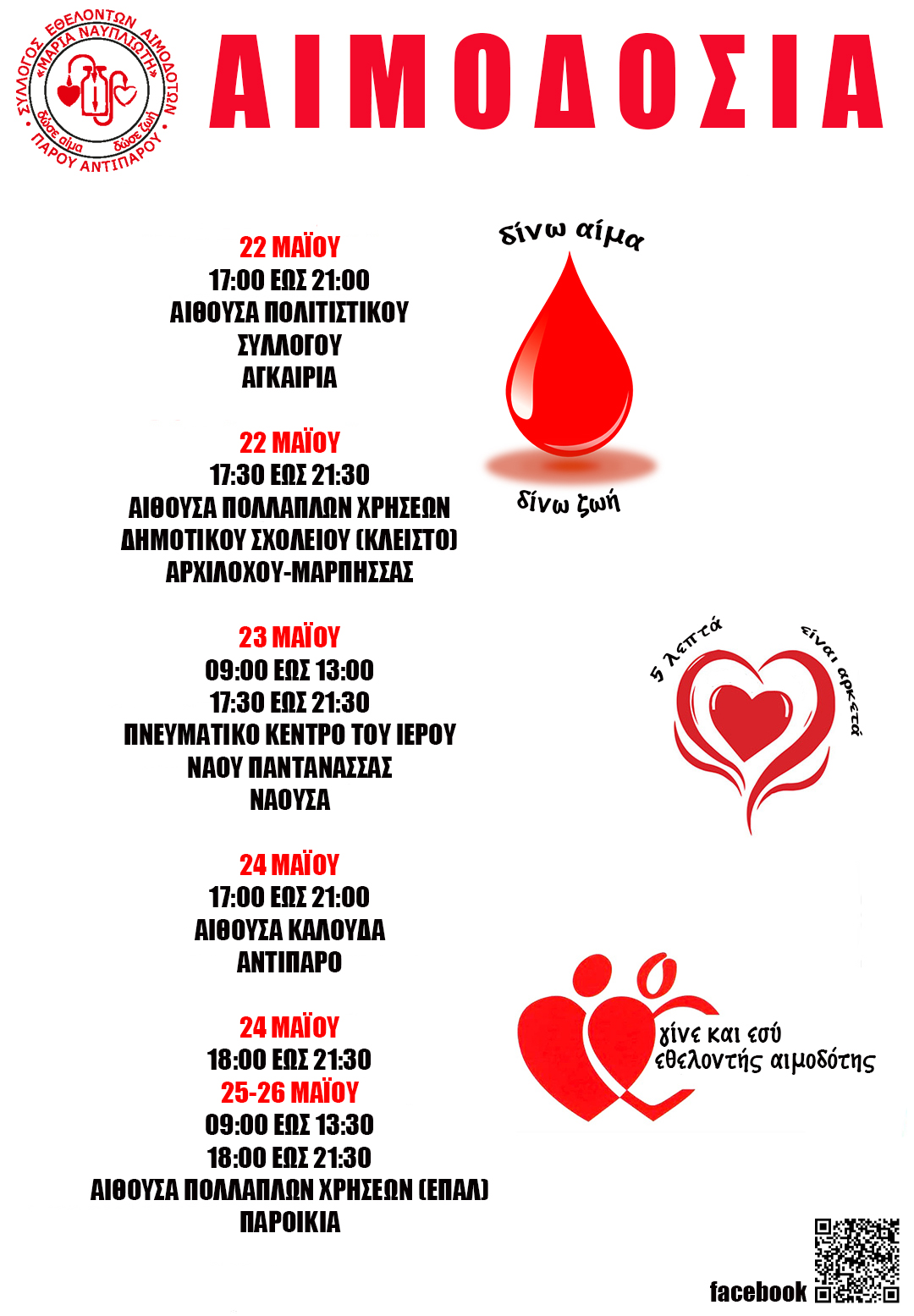 Ανακοινώθηκε το πρόγραμμα για την εαρινή αιμοδοσία στο νησί της Πάρου. Ξεκινά από 22 Μαΐου και ολοκληρώνεται 26 Μαΐου.