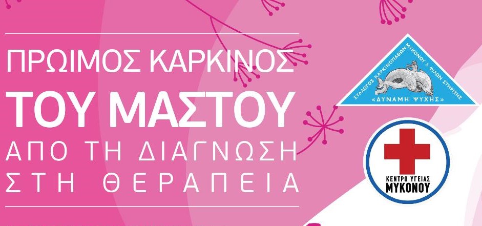 Στο πλαίσιο αυτό, ο Σύλλογος Καρκινοπαθών και Φίλων Στήριξης Μυκόνου, σε συνεργασία με το Γ.Ν.Α. Ιπποκράτειο Νοσοκομείο Αθηνών έχει οργανώσει ένα πρόγραμμα δωρεάν συμβουλών και εξετάσεων στο Κέντρο Υγείας της Μυκόνου, την Παρασκευή 10 Οκτωβρίου και το Σάββατο 11 Οκτωβρίου.