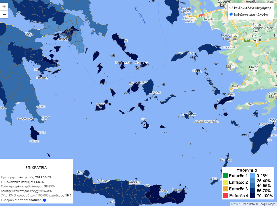 Παρ’ όλα αυτά, σίγουρα η νησιωτική χώρα (Κυκλάδες, Δωδεκάνησα, νησιά Ιονίου και Κρήτη) φαίνεται να βρίσκεται σε ιδιαίτερα υψηλό επίπεδο θωράκισης, τόσο σε σχέση με το μέσο όρο της χώρας (58,8% ολοκληρωμένοι εμβολιασμοί), όσο και με περιοχές της ηπειρωτικής Ελλάδας, όπου η εμβολιαστική κάλυψη δεν ξεπερνά το 30-40%.