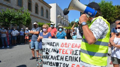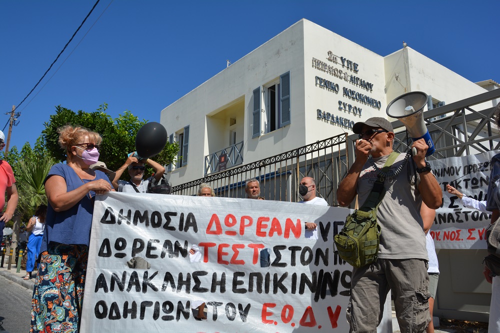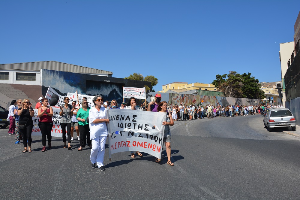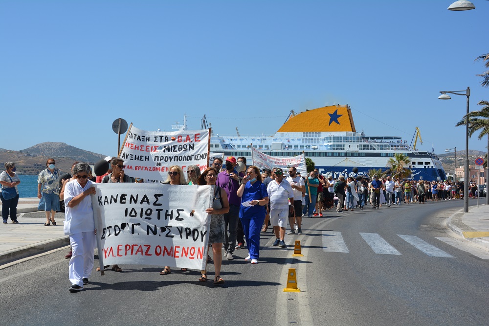 Εργαζόμενοι και κάτοικοι της Σύρου συγκεντρώθηκαν από νωρίς έξω από το νοσοκομείο από όπου λίγο αργότερα ξεκίνησε πορεία διαμαρτυρίας με κατεύθυνση την πλατεία Μιαούλη.