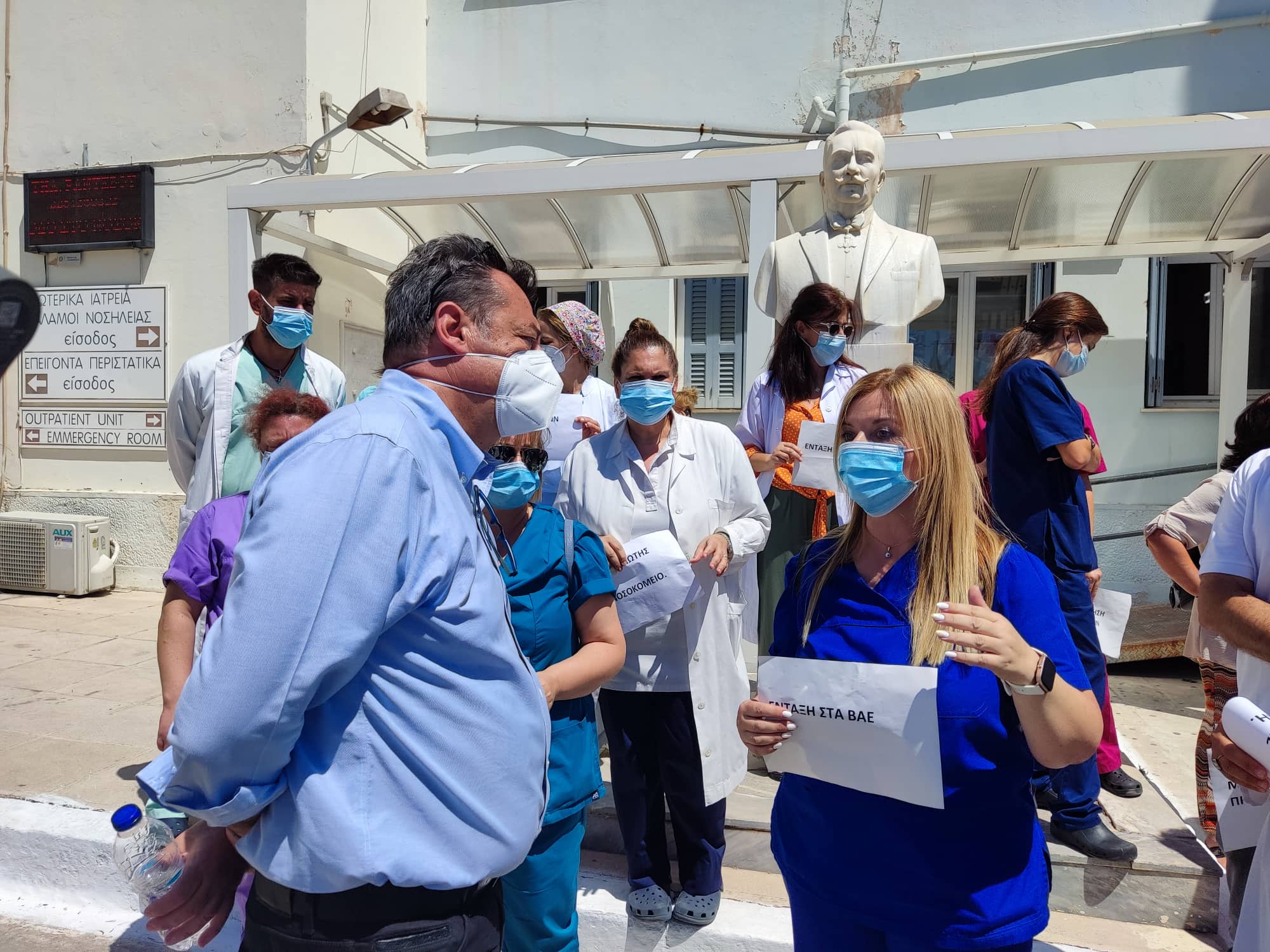 Στον εξωτερικό χώρο είχαν συγκεντρωθεί μέλη του σωματείου εργαζομένων του νοσοκομείου Σύρου και μέλη του ΔΣ της ΕΙΝΟΣ.