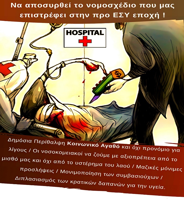 Η Ένωση ιατρών του νομαρχιακού Νοσοκομείου Σύρου, υποστηρίζοντας τις αποφάσεις της Ομοσπονδίας Ενώσεων Νοσοκομειακών Γιατρών Ελλάδος, Αθήνας, Πειραιά, Θεσσαλονίκης, Αχαΐας, Ηπείρου, Κρήτης, Β. Ελλάδας, Γρεβενών, Καστοριάς, Θράκης, Θεσσαλίας, Αιτωλοακαρνανίας, Βοιωτίας και Νήσων Αιγαίου, απαιτεί να αποσυρθεί το νομοσχέδιο, το οποίο καταργεί τη δημόσια υγείας ως κοινωνικό αγαθό, ιδιωτικοποιώντας τα δημόσια νοσοκομεία και μετατρέποντας της υγείας σε ακριβό εμπόρευμα.