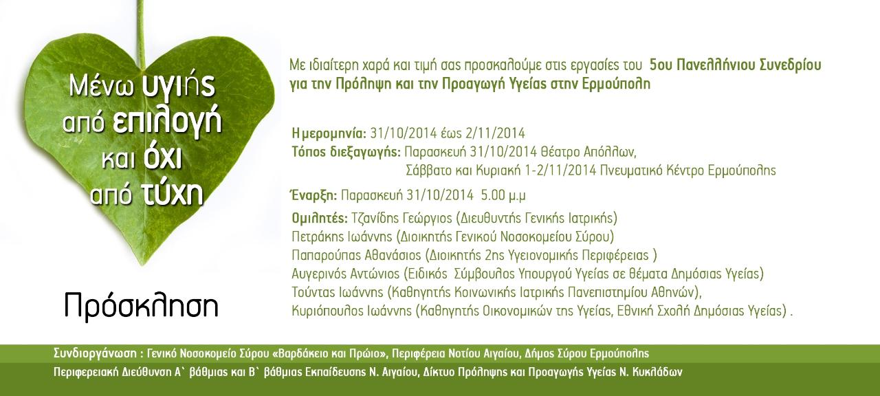 Με στόχο την ανάδειξη βέλτιστων εργαλείων πρόσβασης σε ανταποδοτικές υπηρεσίες υγείας, μέσω της πρόληψης και της προαγωγής υγείας πραγματοποιείται φέτος το 5ο ετήσιο συνέδριο για την πρόληψη και την προαγωγή της υγείας, το οποίο θα λάβει χώρα στο Πνευματικό Κέντρο Ερμούπολης, το Σάββατο 1 και την Κυριακή 2 Νοεμβρίου.