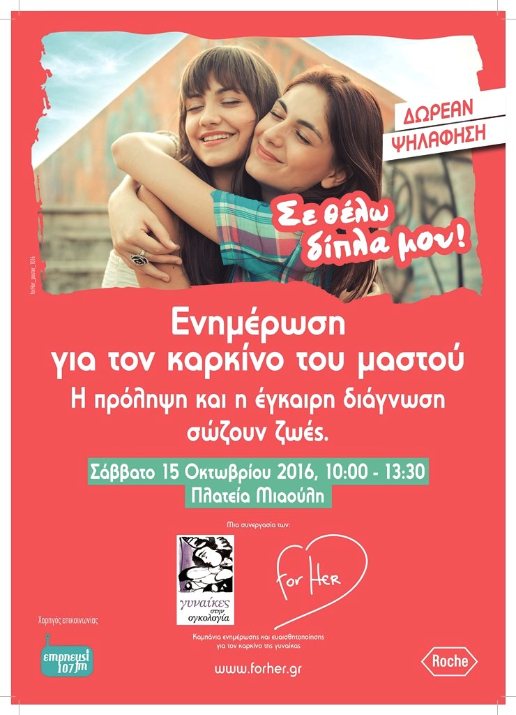 Σταθερή στη θέση της δίπλα στις γυναίκες, η Roche Hellas, συμμετέχει με την καμπάνια «for HER» σε δωρεάν ενημερωτική εκδήλωση που θα πραγματοποιηθεί στην Σύρο, το Σάββατο 15 Οκτωβρίου. Η εκδήλωση πραγματοποιείται από τον σύλλογο «ΓΥΝΑΙΚΕΣ ΣΤΗΝ ΟΓΚΟΛΟΓΙΑ – W4O Hellas» με στόχο την ενημέρωση και ευαισθητοποίηση των γυναικών για τους γυναικολογικούς καρκίνους και τον καρκίνο του μαστού.