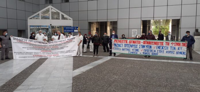 Άμεση ενίσχυση του Εθνικού Συστήματος Υγείας με προσωπικό ζήτησαν οι εργαζόμενοι του Νοσοκομείου Βόλου στη σημερινή τους κινητοποίηση στον εξωτερικό χώρο του Αχιλλοπούλειου.