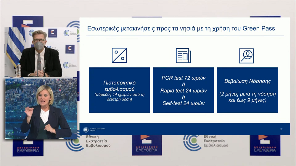 Από την 1η Ιουνίου τίθεται σε παραγωγική λειτουργία το Ευρωπαϊκό Πράσινο Πιστοποιητικό, που έρχεται να υλοποιήσει την πρόταση της δικής μας χώρας, για διευκόλυνση των ταξιδιών σε όλους, όσοι έχουν εμβολιαστεί ή φέρουν αρνητικό τεστ. Ταυτόχρονα, με τον προηγμένο αλγόριθμο EVA θα συνεχίσουμε να πραγματοποιούμε στοχευμένους δειγματοληπτικούς ελέγχους στις πύλες εισόδου της χώρας μας, αναλόγως του επιδημιολογικού φορτίου της χώρας προέλευσης κάθε επισκέπτη μας. [..]