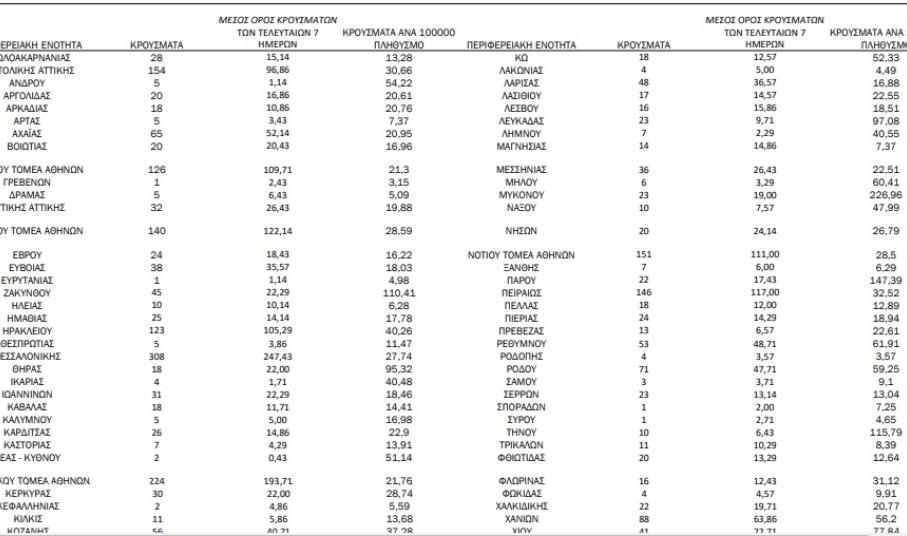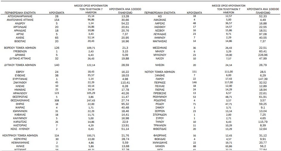 Από το σύνολο των 2.874 νέων κρουσμάτων του νέου ιού στη χώρα χθες, 15 είναι εισαγόμενα εκ των οποίων 10 εντοπίστηκαν κατόπιν ελέγχων στις πύλες εισόδου της χώρας. Η κατανομή των 2.859 νέων εγχώριων κρουσμάτων ανά Περιφερειακή Ενότητα παρουσιάζεται στον κατωτέρω πίνακα.