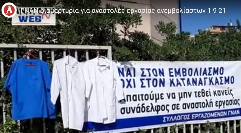 Την αντίδρασή τους στις αναστολές εργασίας από σήμερα 1/9 των ανεμβολίαστων υγειονομικών διατράνωσαν με συγκέντρωση διαμαρτυρίας έξω από τα ΤΕΠ του Γενικού Νοσοκομείου Αγίου Νικολάου και με παράσταση διαμαρτυρίας στη διοίκηση στη συνέχεια μέλη του Συλλόγου Εργαζομένων του ΓΝΑΝ και προσωπικό της δομής.