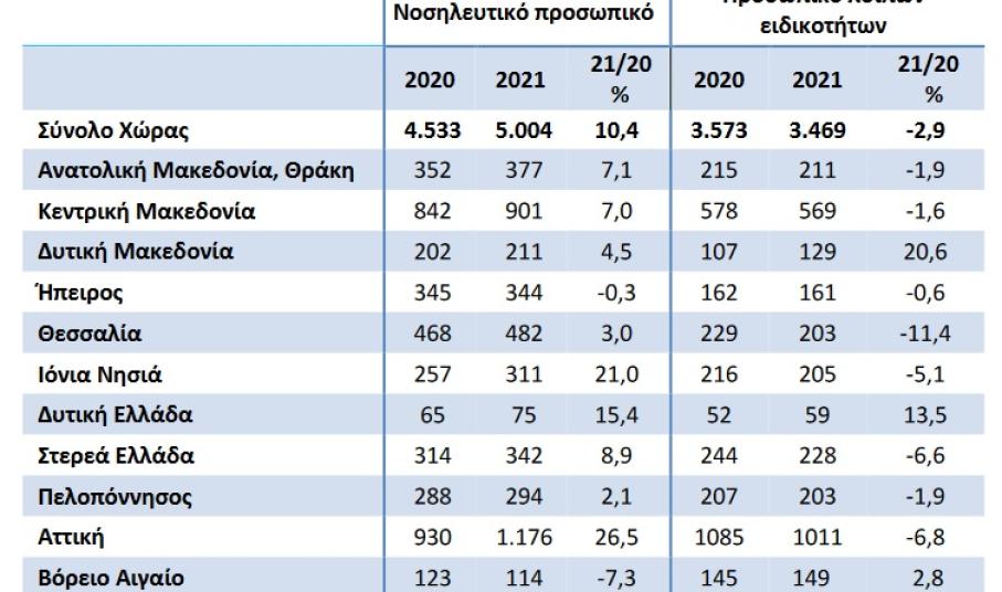 • Το νοσηλευτικό προσωπικό αυξήθηκε το 2021 σε σχέση με το 2020 κατά 10,4% στο σύνολο της χώρας. Αύξηση παρατηρείται κατά το 2021 σε σχέση με το 2020 σε όλες σχεδόν τις Περιφέρειες, με σημαντικότερη αυτή στις Περιφέρειες Αττικής και Ιονίων Νήσων με 26,5% και 21,0% αντίστοιχα.