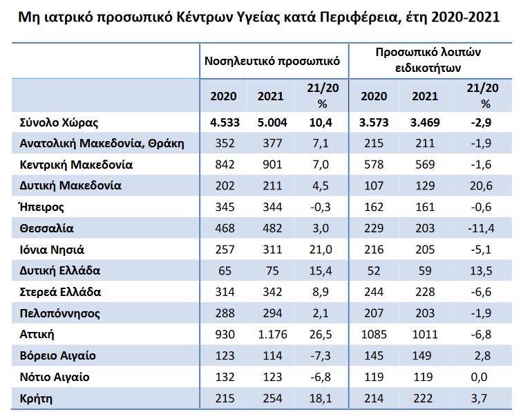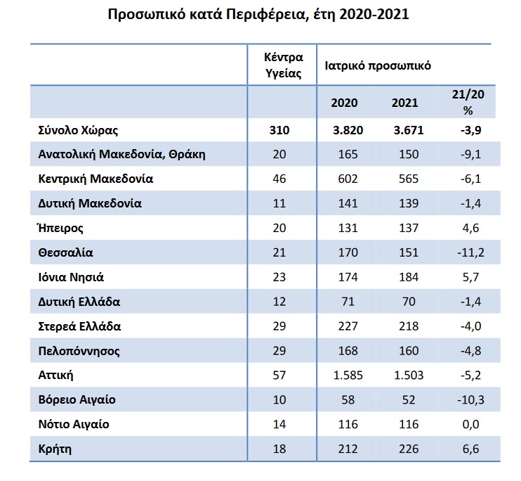 • Ο αριθμός του ιατρικού προσωπικού που απασχολείται στα Κέντρα Υγείας παρουσίασε μείωση κατά 3,9% το 2021 σε σχέση με το 2020, στο σύνολο της χώρας. Αύξηση παρατηρείται το 2021 σε σχέση με το 2020 στις Περιφέρειες Κρήτης και Ιόνιων Νήσων κατά 6,6% και 5,7%, αντίστοιχα. Αντίθετα, μειώσεις παρατηρήθηκαν στις περισσότερες περιφέρειες το 2021 σε σχέση με το 2020 με μεγαλύτερες μειώσεις στις Περιφέρειες Θεσσαλίας και Βόρειου Αιγαίου κατά 11,2% και 10,3% αντίστοιχα.
