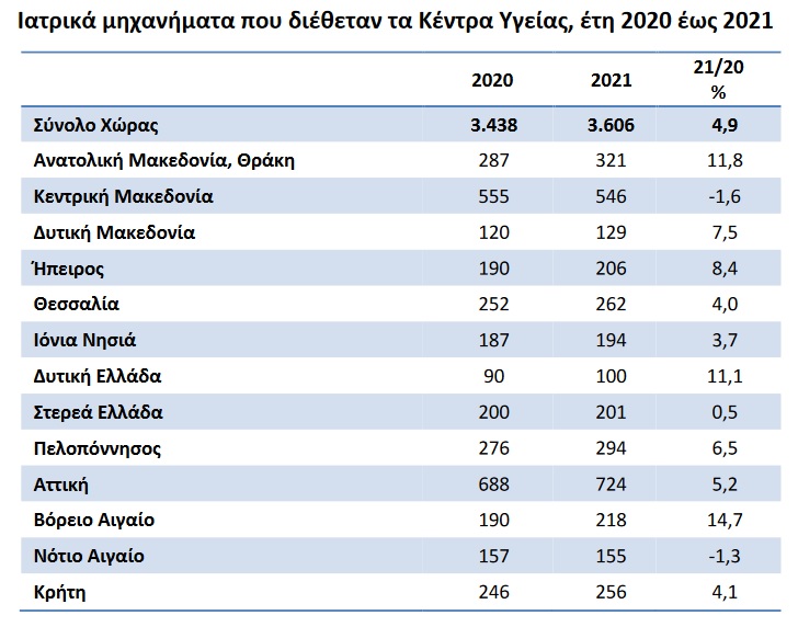 • Στα ιατρικά μηχανήματα που διαθέτουν τα Κέντρα Υγείας, παρατηρήθηκε αύξηση στο σύνολο της χώρας το 2021 σε σχέση με το 2020 κατά 4,9%.