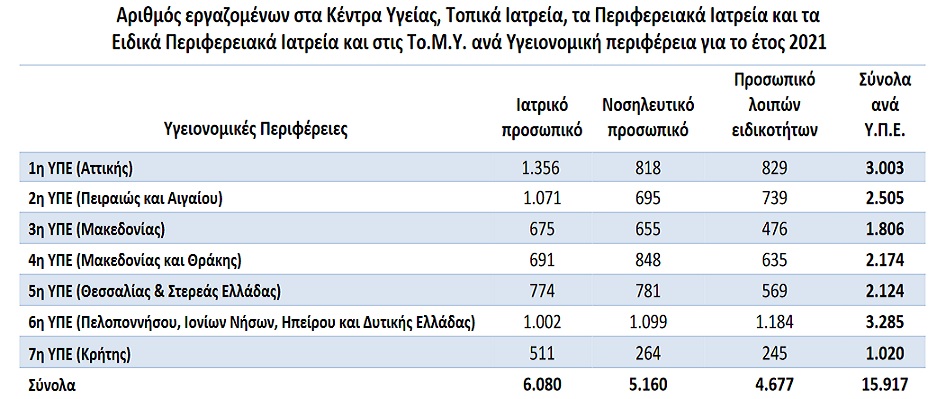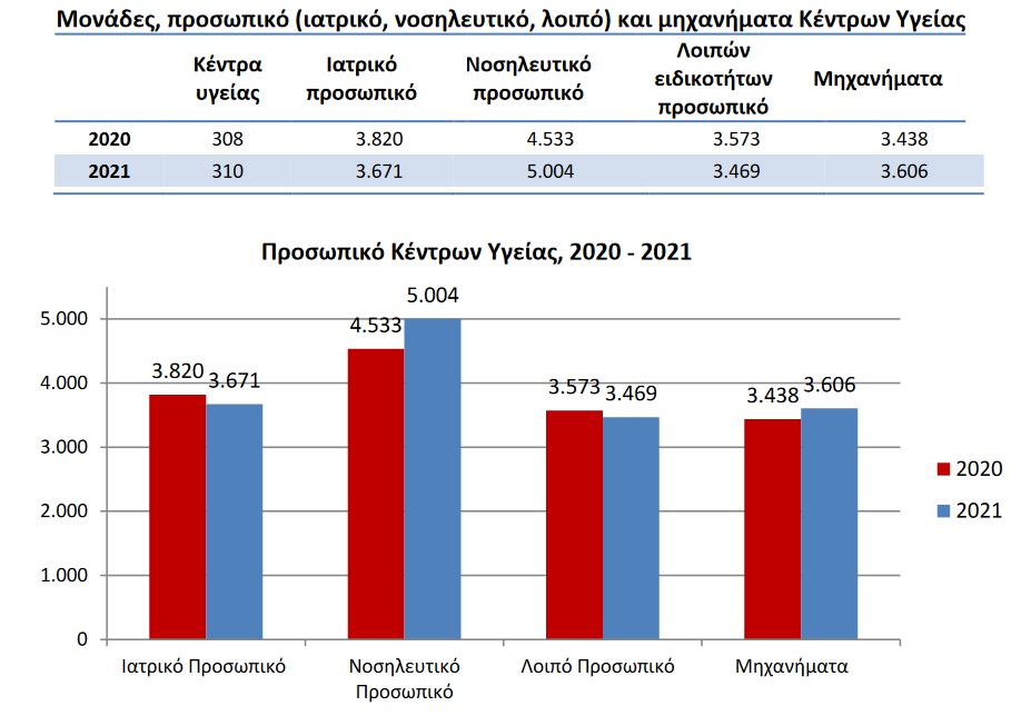 Ο συνολικός αριθμός των Κέντρων Υγείας το 2021 ανήλθε σε 310. Από την κατανομή των Κέντρων Υγείας στις 13 Περιφέρειες της Χώρας, παρατηρείται ότι τα περισσότερα Κέντρα Υγείας βρίσκονται στην Αττική (57 κέντρα) στην Κεντρική Μακεδονία (46 κέντρα), στην Πελοπόννησο (29 κέντρα) και στη Στερεά Ελλάδα (29 κέντρα) ενώ τα λιγότερα βρίσκονται στο Βόρειο Αιγαίο (10 κέντρα) και τη Δυτική Μακεδονία (11 κέντρα).