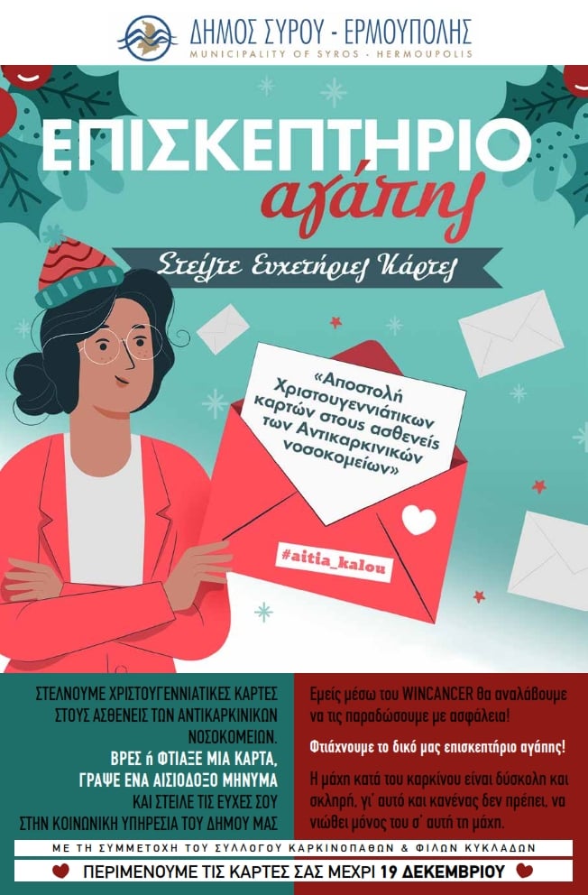 Πρωτοβουλία για την αποστολή Χριστουγεννιάτικων καρτών στους ασθενείς των αντικαρκινικών νοσοκομείων μέχρι 19 Δεκεμβρίου.