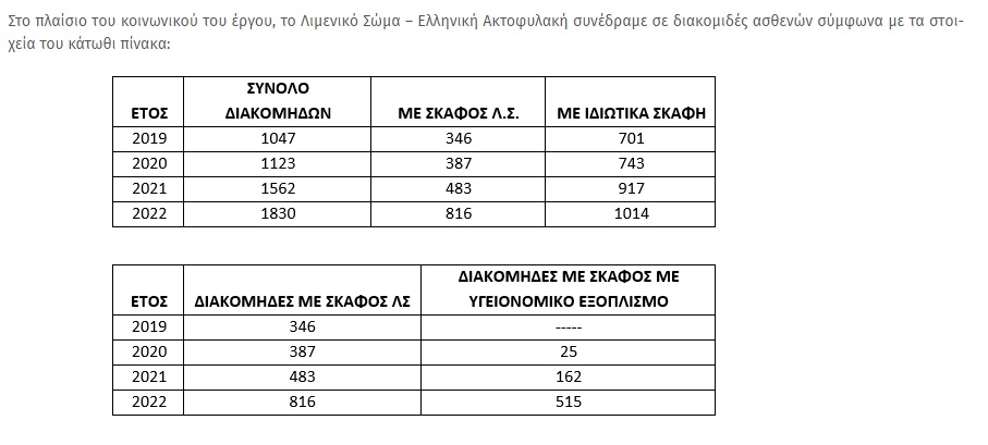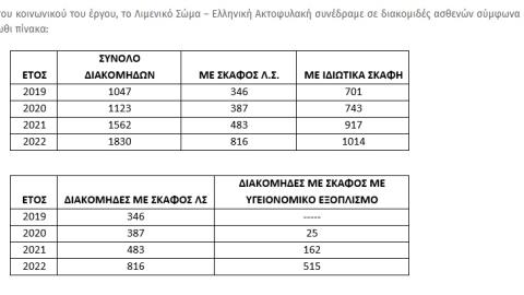 Όπως είναι γνωστό το Λιμενικό Σώμα – Ελληνική Ακτοφυλακή διαθέτει σήμερα έναν στόλο οκτώ περιπολικών σκαφών με υγειονομικό εξοπλισμό που έχουν ναυπηγηθεί στην Ελλάδα, σύμφωνα με προδιαγραφές που εκπονήθηκαν από στελέχη του Λιμενικού Σώματος - Ελληνικής Ακτοφυλακής με τη συνδρομή του Ε.Κ.Α.Β. και της Υγειονομικής Υπηρεσίας του Υ.ΝΑ.Ν.Π.