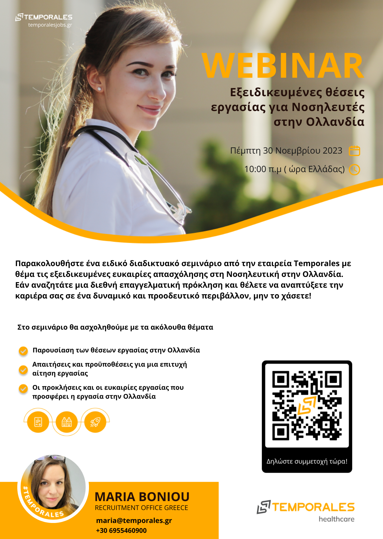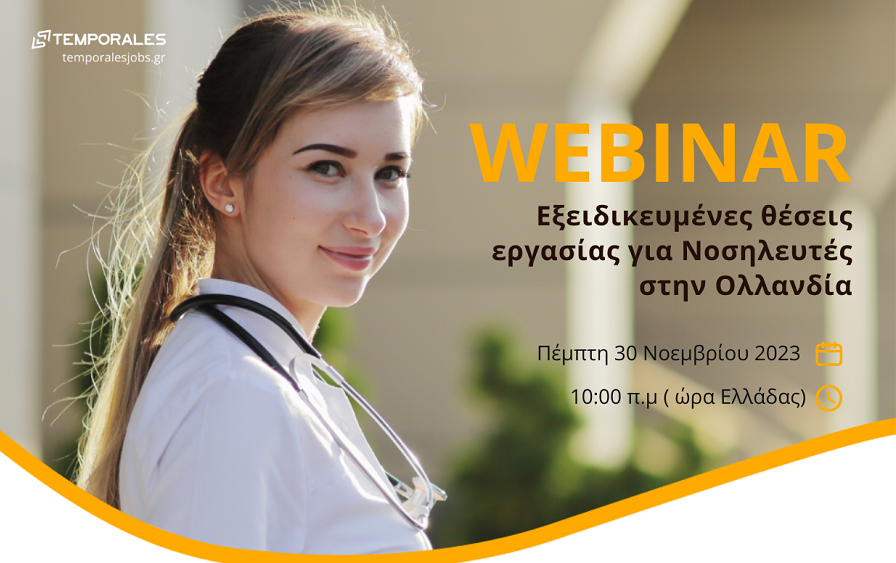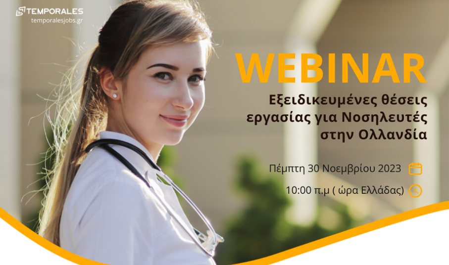 Το ΔΙΕΚ Νοσοκομείου Σύρου και η εταιρεία TEMPORALES διοργανώνουν παρουσίαση στις 30 Νοεμβρίου (10.00 ώρα Ελλάδας) σχετικά με θέσεις νοσηλευτών ή βοηθών νοσηλευτών στην Ολλανδία.