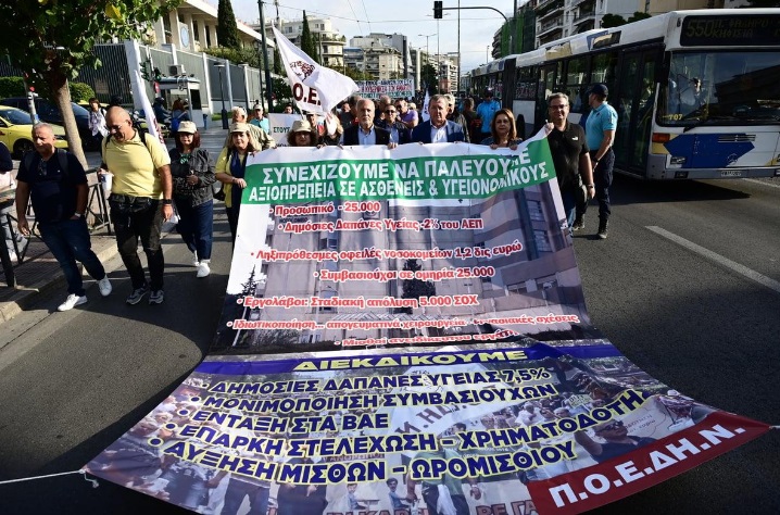 Σε εξέλιξη βρίσκεται η πορεία των υγειονομικών από την πλατεία Μαβίλης προς το υπουργείο υγείας στο πλαίσιο της πανελλαδικής κινητοποίησης των εργαζομένων στα δημόσια νοσοκομεία και της 24ωρης απεργίας που έχει κηρύξει η ΠΟΕΔΗΝ.