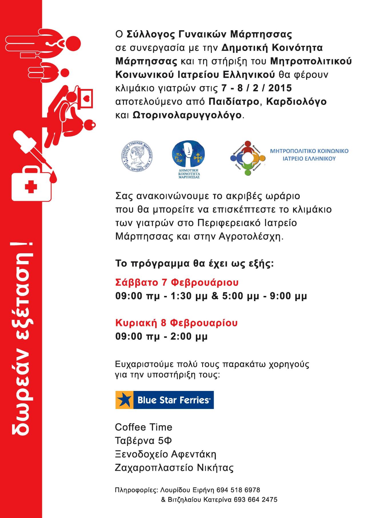 Ο Σύλλογος Γυναικών Μάρπησσας, σε συνεργασία με τη Δημοτική Κοινότητα Μάρπησσας, αλλά και με τη στήριξη του Μητροπολιτικού Κοινωνικού Ιατρείου Ελληνικού, για ακόμη μια φορά, φέρνουν κλιμάκιο ιατρών στο νησί.