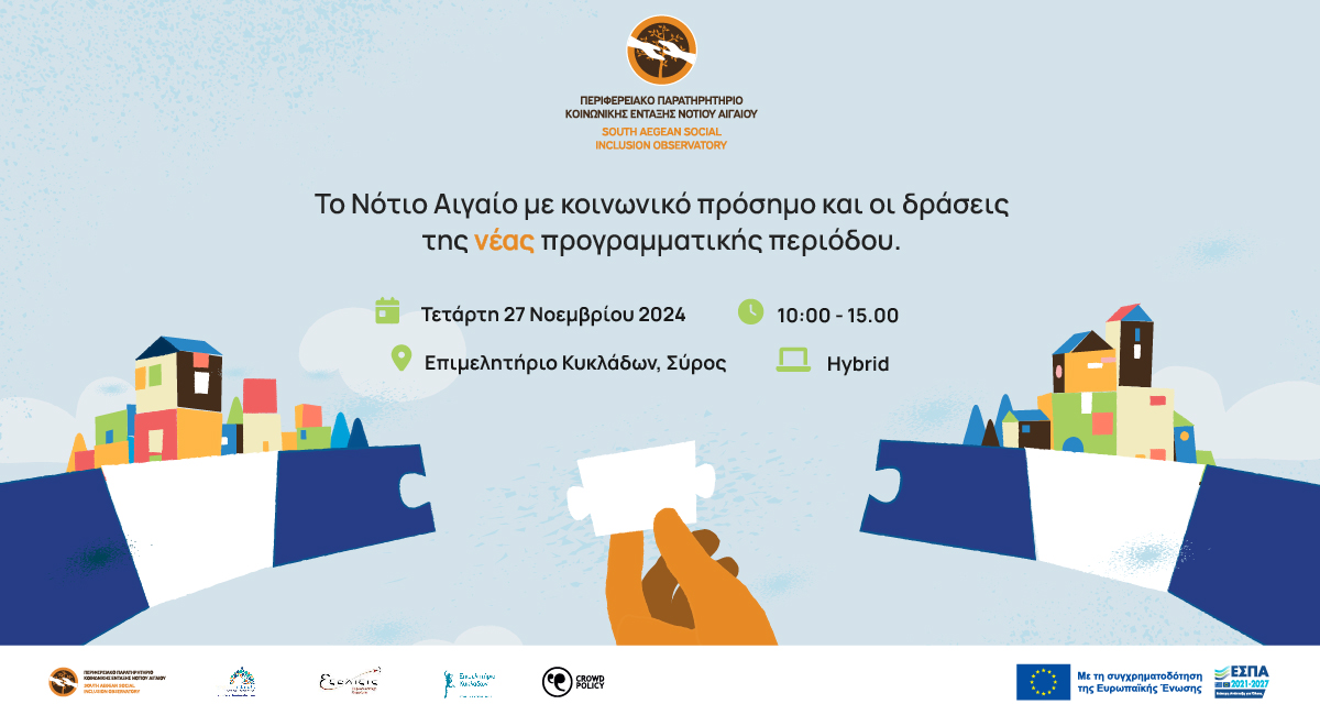Ενημερωτική εκδήλωση του Παρατηρητηρίου Κοινωνικής Ένταξης της Περιφέρειας Νοτίου Αιγαίου που θα πραγματοποιηθεί την Τετάρτη 27/11/2024 στις 10 π.μ. σ...