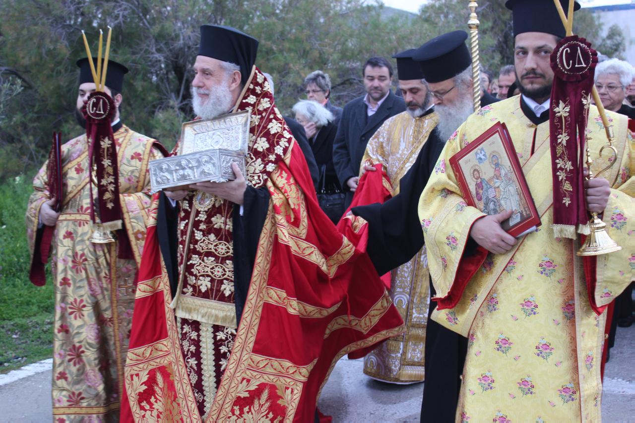 Η υποδοχή των ιερών Λειψάνων των Αγίων Θεοδώρων Τήρωνος και Στρατηλάτου, διακομιζομένων εξ' Αθηνών από τον Ι. Ναό του Αγίου Ευσταθίου Περισσού πραγματ...