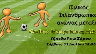 Το Σάββατο 11 Ιουλίου στις 18:00 το απόγευμα θα διεξαχθεί φιλικός - φιλανθρωπικός αγώνας μεταξύ των Φίλων Πάνου και των Παλαιμάχων Ποδοσφαιριστών Σύρο...