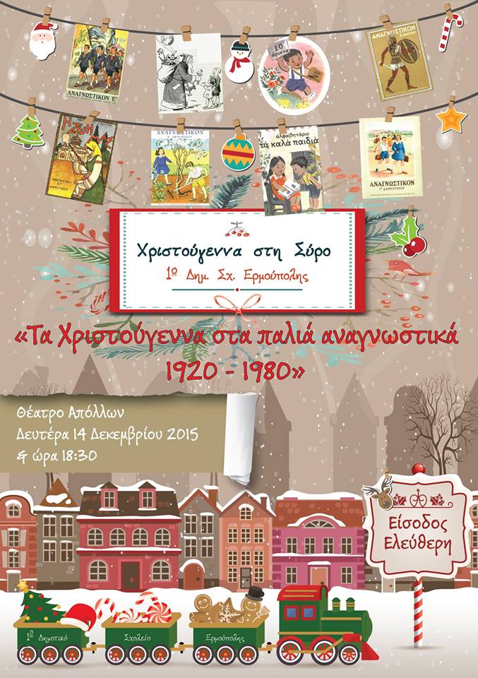 Εκδήλωση με θέμα «Τα Χριστούγεννα στα παλαιά αναγνωστικά 1920-1980» διοργανώνει το 1ο Δημοτικό Σχολείο Ερμούπολης τη Δευτέρα 14 Δεκεμβρίου 2015 και ώρ...