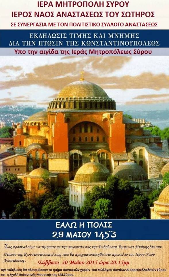 Ο Ιερός Ναός Αναστάσεως του Σωτήρος σε συνεργασία με τον Πολιτιστικό Σύλλογο Αναστάσεως διοργανώνει Εκδήλωση Τιμής και Μνήμης δια την Πτώσιν της Κωνστ...