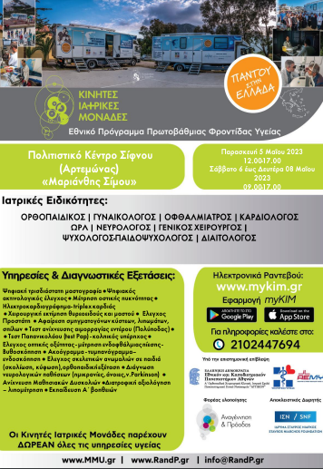 Οι «Κινητές Ιατρικές Μονάδες» από 05/05 – 08/05/2023 στη Σίφνο με δωρεάν Υπηρεσίες Υγείας Ιατρικές Ειδικότητες: Καρδιολόγος – Ορθοπαιδικός ...