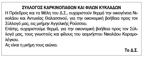 Δωρεές στο Σύλλογο Καρκινοπαθών και φίλων Κυκλάδων Κείμενο Βλέπε εικόνα. Αριθμός Φύλλου: Αριθμός Φύλλου 6151 Κατηγορία: Κατηγορία Δωρεές