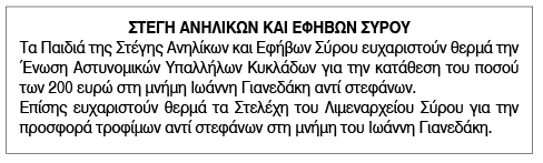 Ευχαριστήριο από τη Στέγη Ανηλίκων και Εφήβων Σύρου Κείμενο Βλέπε εικόνα. Αριθμός Φύλλου: Αριθμός Φύλλου 6151 Κατηγορία: Κατηγορία Δωρεές
