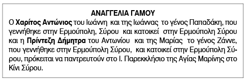 Αναγγελία Γάμου για Χαρίτο Αντώνιο και Πρίντεζη Δήμητρα Κείμενο Βλέπε εικόνα. Αριθμός Φύλλου: 6153 Κατηγορία: Αναγγελία Γάμου